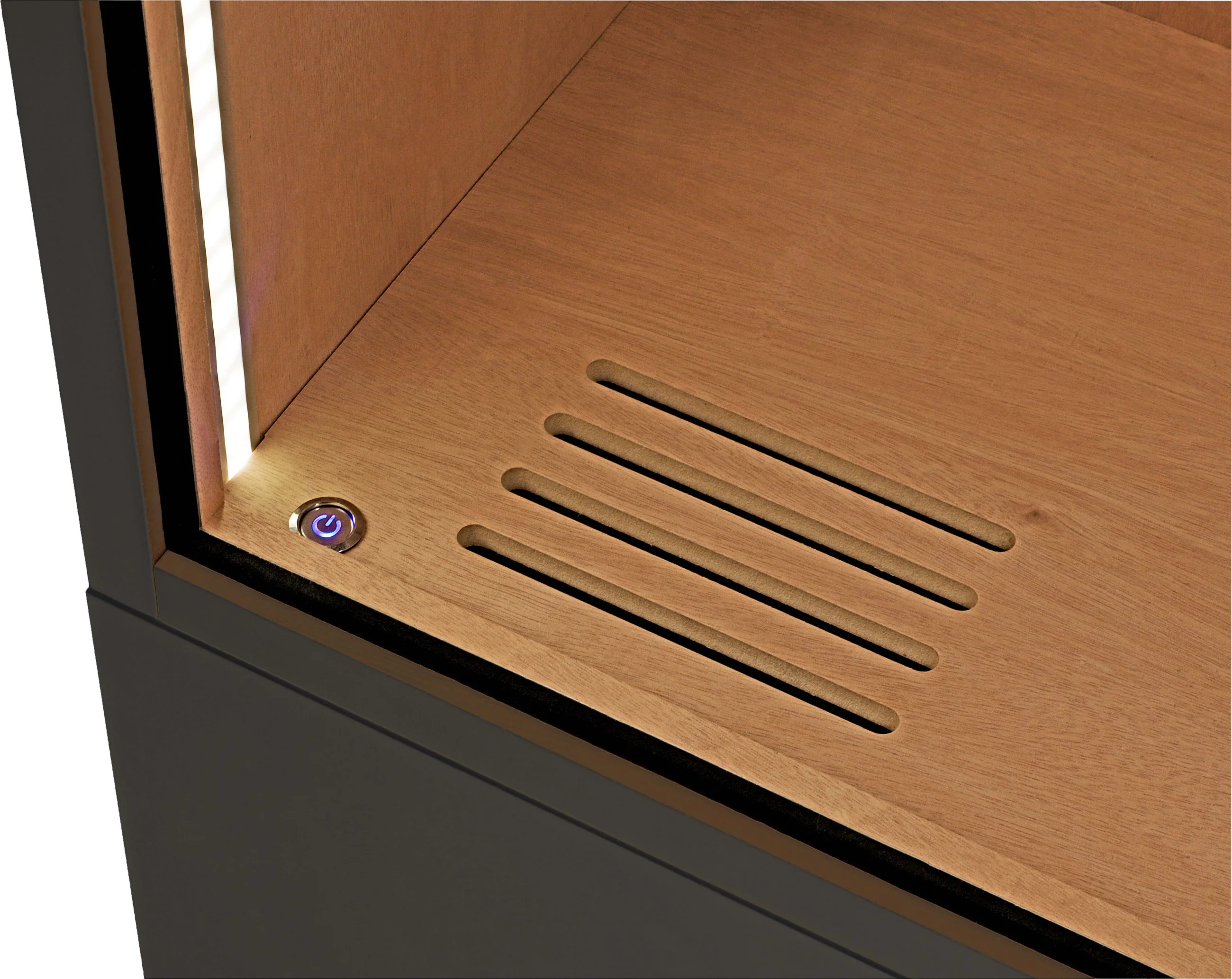- Umidificazione perfetta controllata da microprocessore e circolazione ideale garantita dalla doppia parete posteriore. L'umidità dell'aria viene distribuita in modo uniforme sui diversi piani dell'humidor.
