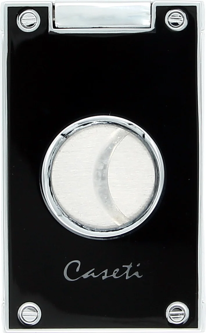 Questa lussuosa creazione presenta una lacca nera e finitura cromata ornata con un logo Caseti di dimensioni di buon gusto che mostra che sei un appassionato di sigari dal gusto impeccabile. La forma rettangolare conferisce anche un'aria di raffinatezza, rendendo la taglierina perfetta per il più formale degli incontri.