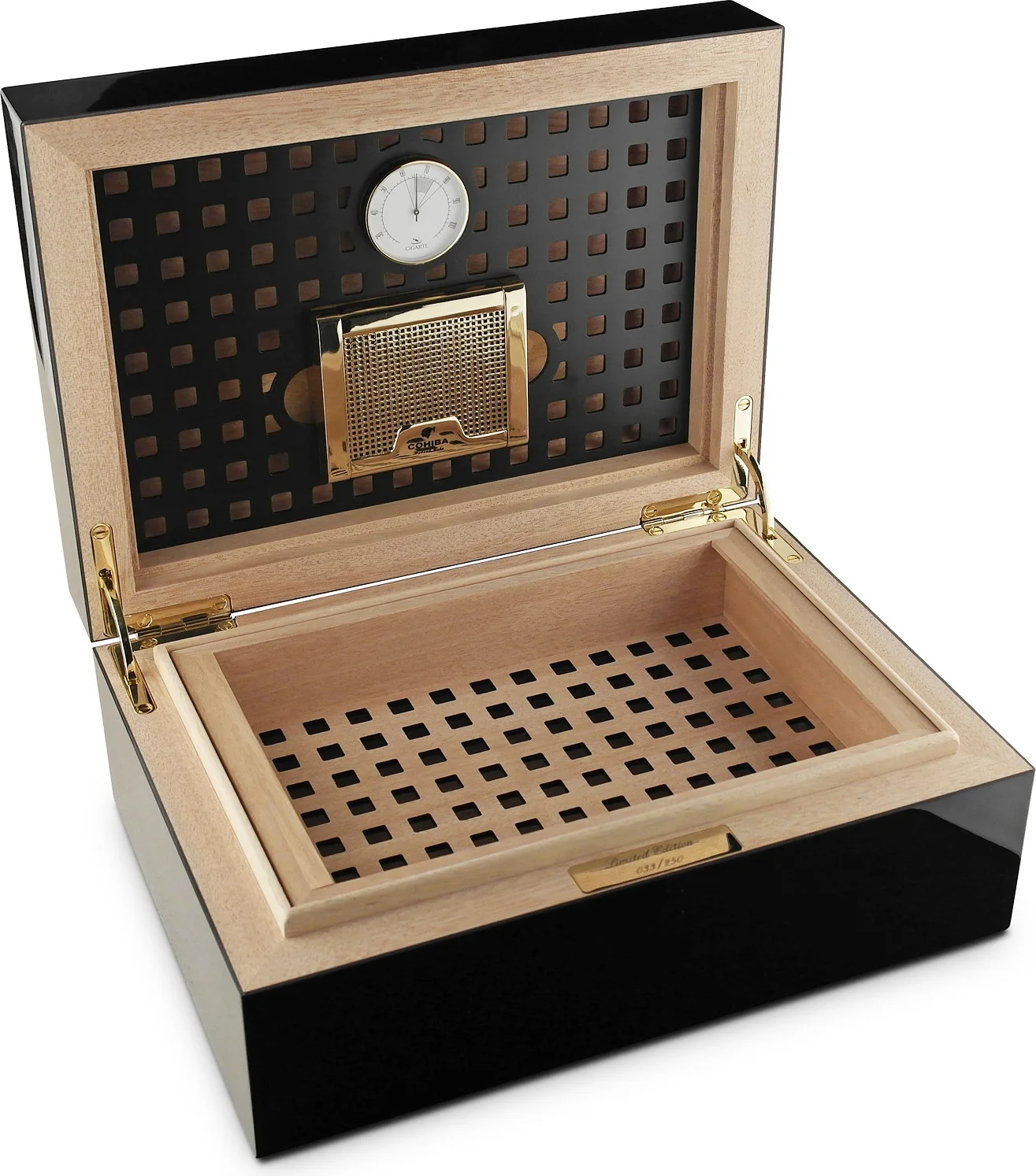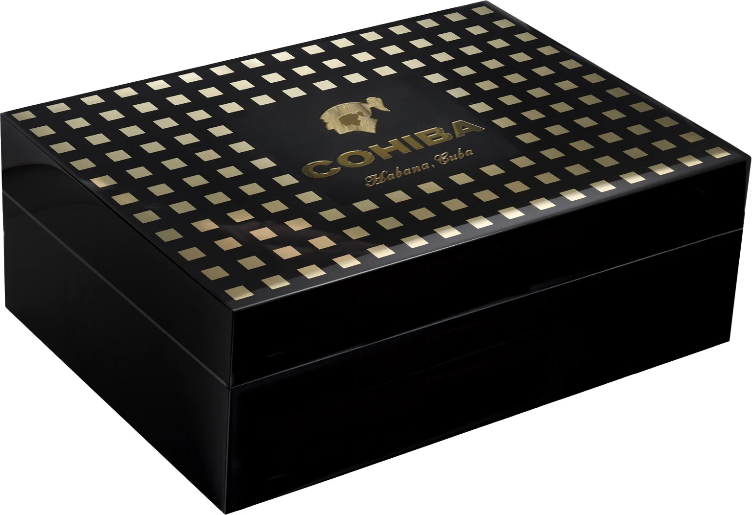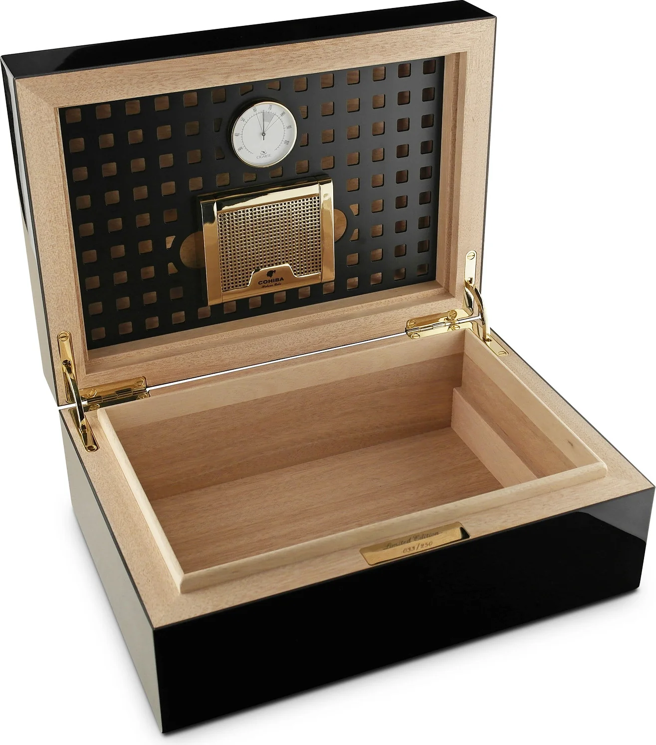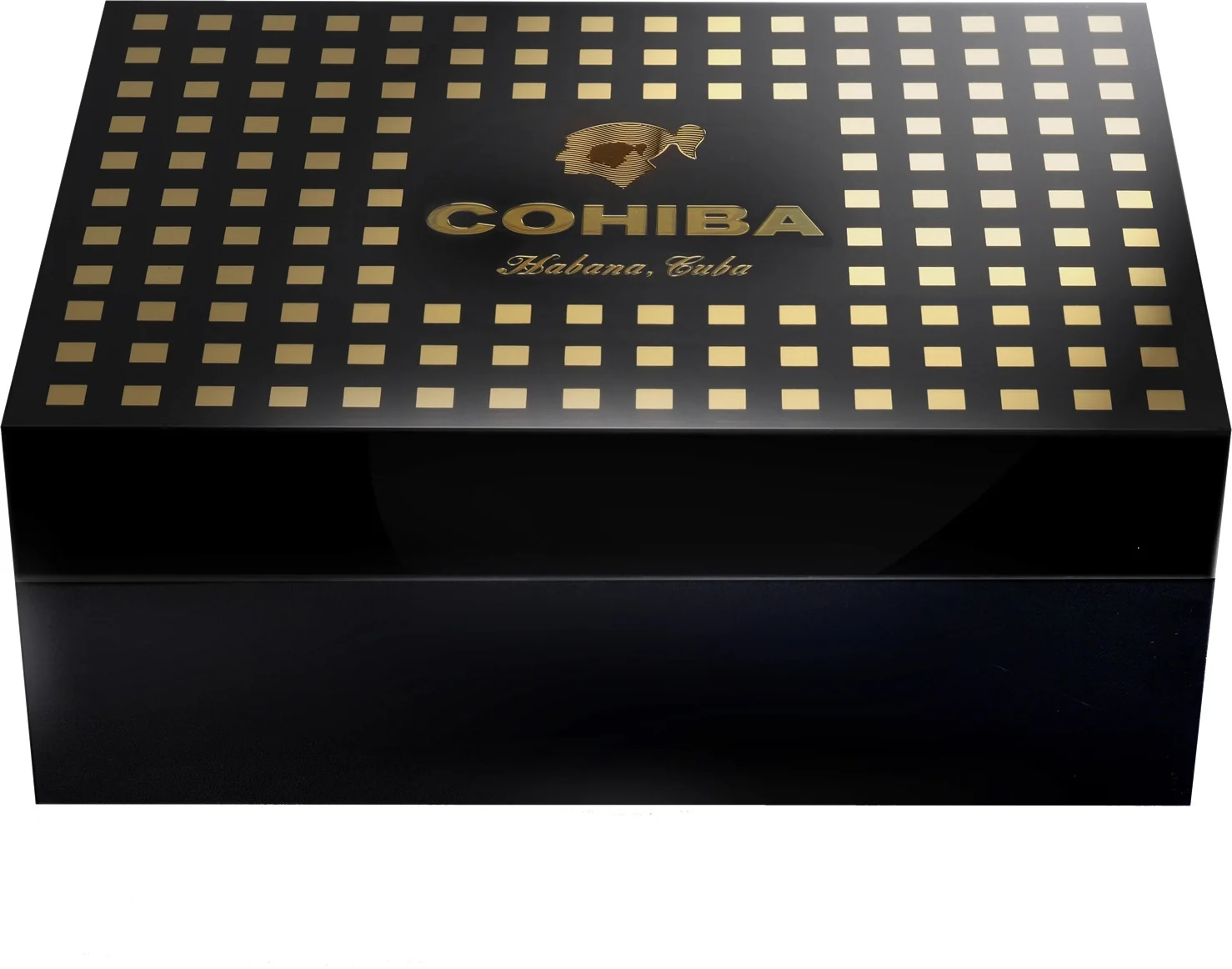 L'humidor presenta una finitura nera lucida che ricorda la lacca di un pianoforte. I tradizionali elementi dorati aggiungono accenti eleganti. Il famoso logo Cohiba è ben visibile sul coperchio. All'apertura, si scoprono cerniere dorate di alta qualità e una targhetta che indica il numero individuale dell'edizione limitata.