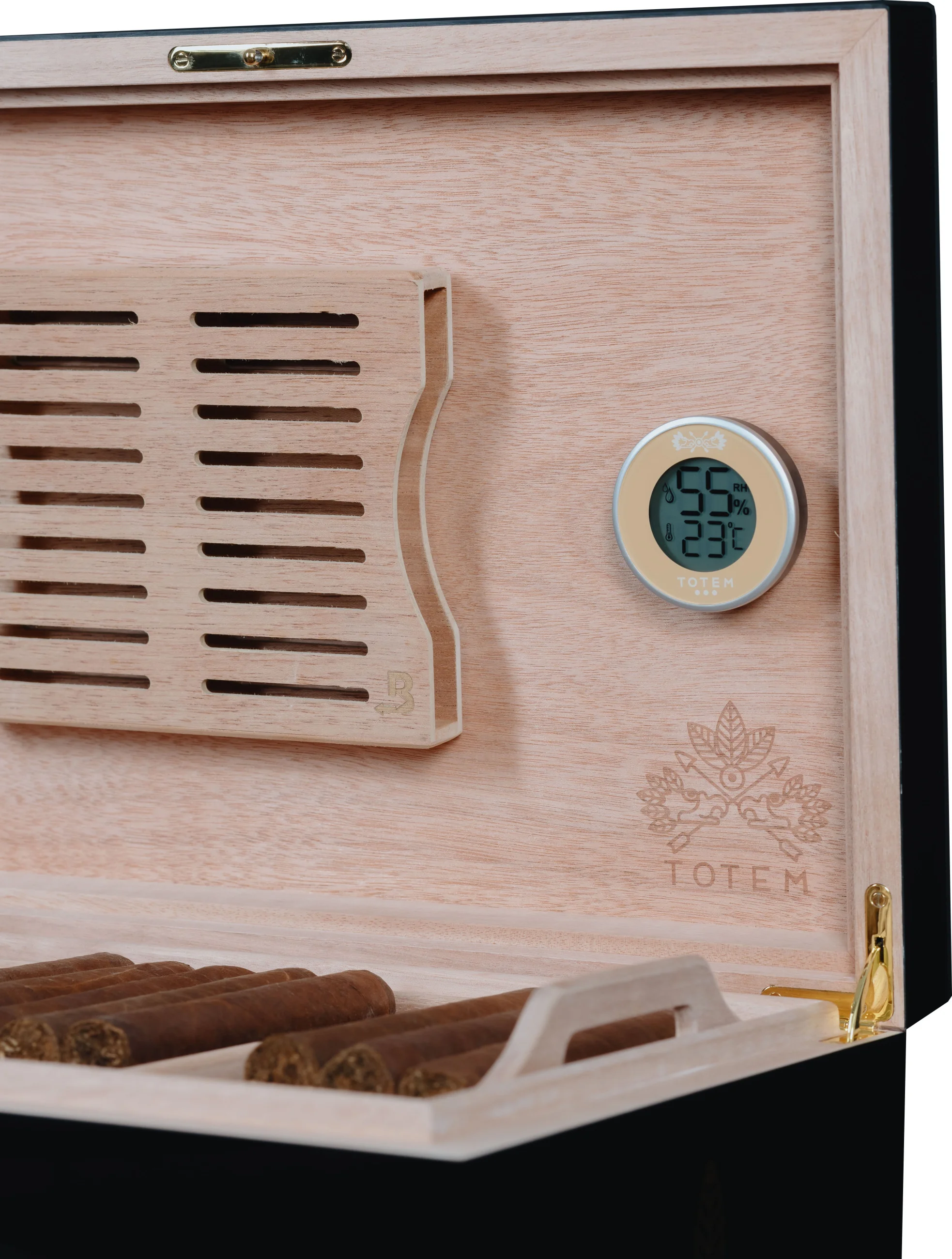 Questo igrotermometro digitale può essere un valido ricambio per i proprietari di humidor Totem o può essere installato in humidor di altre marche. Visualizza l'umidità relativa e la temperatura attuali, che sono importanti indicatori del clima all'interno del tuo humidor. La sua forma rotonda e il suo design salvaspazio si adattano anche agli humidor più piccoli senza sacrificare il volume. È realizzato in metallo e plastica ed è alimentato da una batteria a bottone CR2032, inclusa.