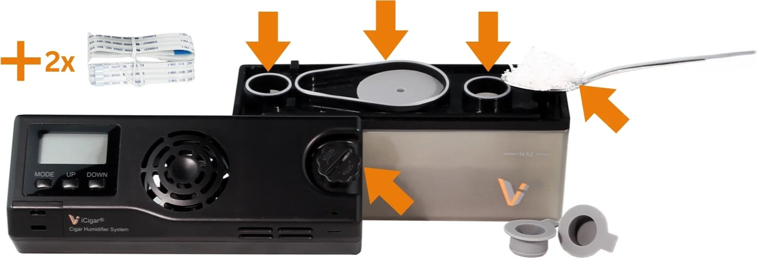 L'umidificatore LV è un sistema di umidificazione elettronico che fornisce un'umidità costante e precisa in molti humidor. La combinazione di controllo a sensore e ventola distribuisce l'umidità in modo uniforme all'interno, garantendo una conservazione ottimale dei sigari. Con il kit di manutenzione appropriato, l'umidificatore LV rimarrà affidabile per anni.
