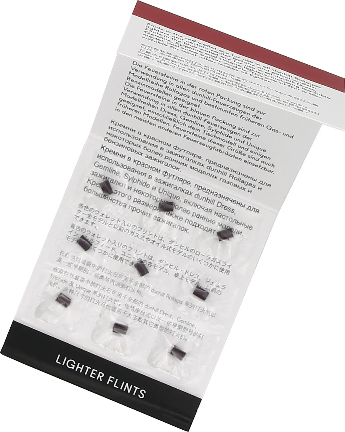Le pietre focaie Dunhill di misura B (rosse) sono state progettate appositamente per gli accendini Dunhill della linea "Rollagas". Una confezione contiene 9 pietre focaie di alta qualità che garantiscono un'accensione affidabile e una lunga durata del tuo accendino Dunhill.