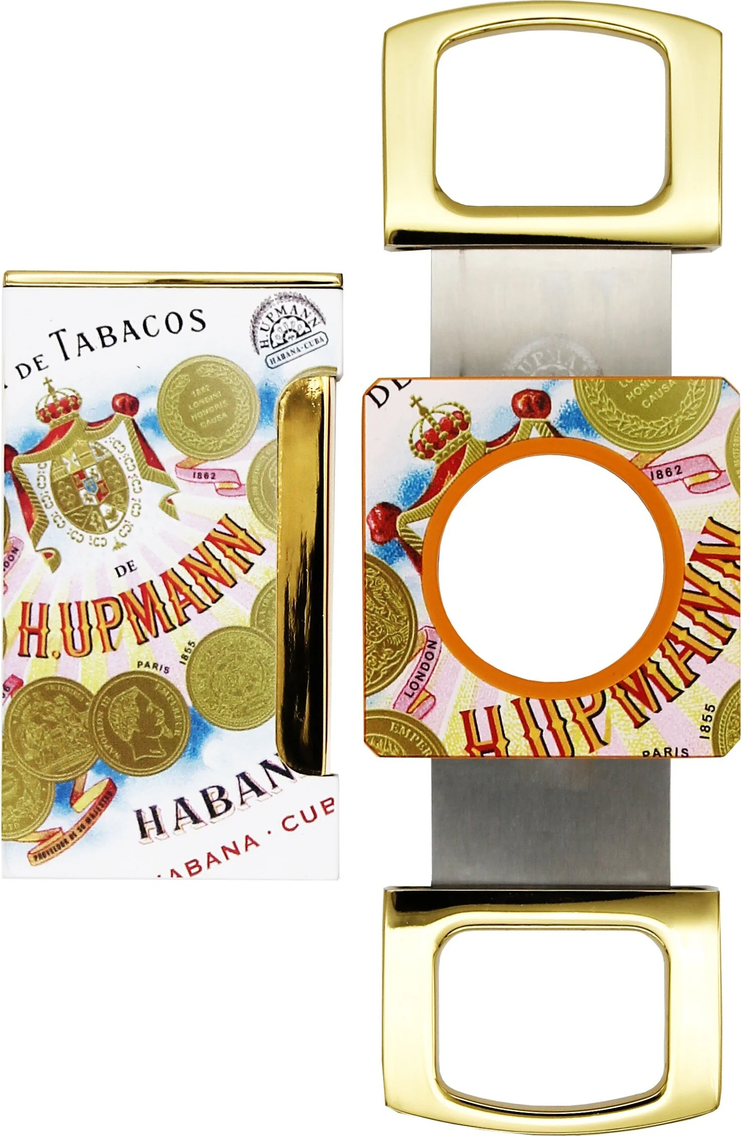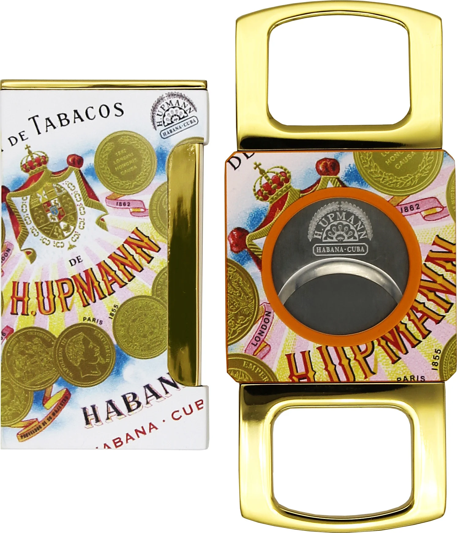 I loghi H. Upmann arancioni sono completati da scintillanti accenti dorati, che conferiscono un aspetto esclusivo sia all'accendino che al taglierino. Il gioco di arancione, oro e alta qualità artigianale rende questo set un compagno elegante e moderno per ogni appassionato di sigari.