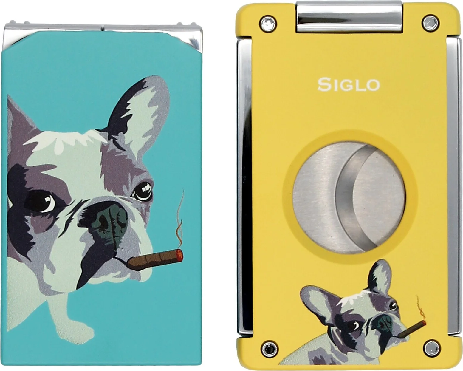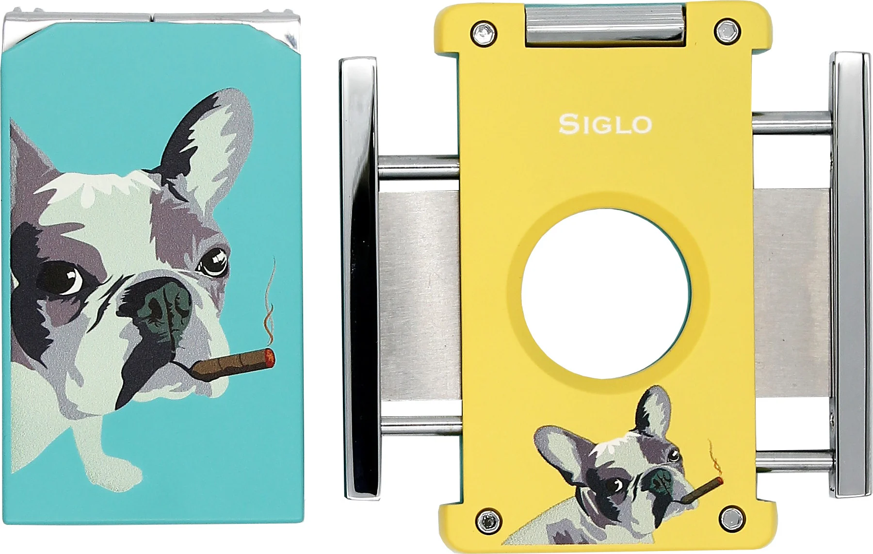 Il set di accendini e tagliasigari Siglo Dog è un duo di accessori dal design accattivante e creativo per gli amanti dei sigari. Entrambi gli accessori presentano un Bulldog francese fumante in stile pop art. I dorsi riprendono il motivo con un tipico motivo a pois, sottolineando il carattere artistico del design. Il set cattura immediatamente l'attenzione e aggiunge un tocco moderno e spiritoso a qualsiasi collezione di sigari.