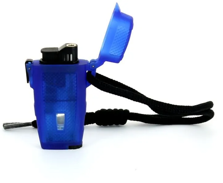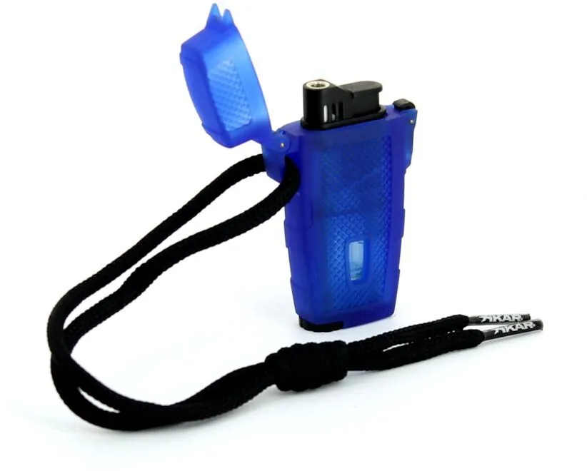 Accendino Xikar modello Stratosphere in blu. Questo accendino da esterno con fiamma turbo a prova di tempesta è composto da un corpo di gomma e di un indicatore di livello facilmente visibile.